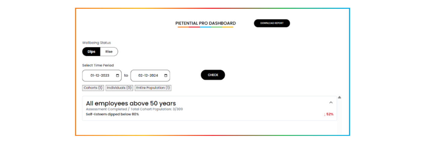 - Comparative Analytics: Ability to view wellbeing across demographics, departments, or timeframes.