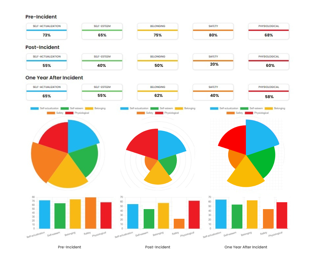 A university using Pietential benchmarked the overall wellbeing of students, faculty, and staff across all domains – physiology, safety, belonging, esteem, and self- actualization. Pre-incident assessments, represented in Pie Chart 1, indicate a healthy, vibrant campus community, with wellbeing scores balanced across all markers.