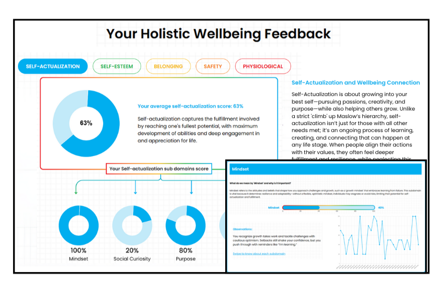 Holistic Wellbeing Assessment: The platform provides a quick and comprehensive assessment of individuals’, cohorts’ and total population wellbeing, covering dimensions such as physiology, belonging, safety, self-esteem, and selfactualization.