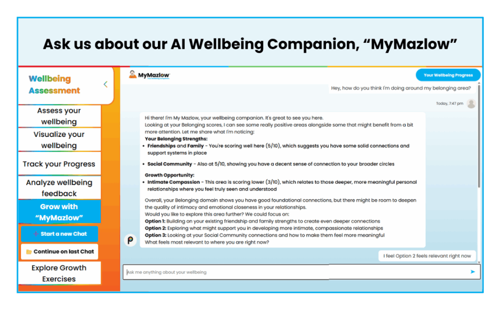 Real-time Feedback and Coaching: Users receive immediate visual and written feedback and access to personalized personal growth exercises aligned with their wellbeing assessment results, promoting continuous personal growth and development.