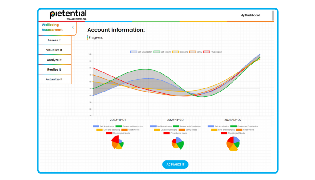 Pietential, a science-backed HR platform, offers a unique lens through which HR leaders can measure and enhance employee wellbeing. By utilizing Pietential’s comprehensive wellbeing assessments, HR professionals can track individual and organizational wellbeing over time, identifying key areas where support or intervention is needed. The platform’s integration of Maslow’s Hierarchy of Needs further allows HR leaders to take a holistic approach, measuring multiple dimensions of human wellbeing—from physiological needs to self-actualization.