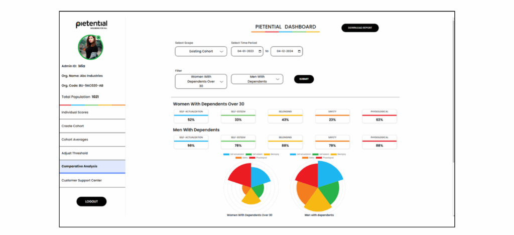 Pietential’s platform allows for deep segmentation of wellbeing data by demographics, roles, departments, and locations. This cohort-based insight is invaluable as it enables you to tailor your recommendations to the specific needs of different groups within a client’s organization.