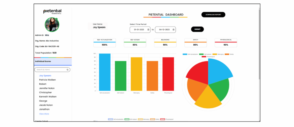 Pietential, a cloud-hosted, science-backed diagnostic, monitoring, and development platform grounded in Maslow’s Hierarchy of Needs (MHN), offers your firm the unique ability to deliver transformative insights based on real-time wellbeing data. By integrating Pietential into your consulting engagements, your firm can provide clients with granular data at the individual, cohort, and total population levels—enabling you to identify wellbeing gaps, uncover risk areas, and propose targeted interventions that address the root causes of poor engagement, performance, and retention. The end result is a deliverable that provides deeper and more actionable solutions to your clients, grounded in validated, real-time insights.