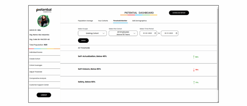 Pietential’s Wellbeing Monitoring feature introduces a proactive approach to identifying and addressing potential risks before they escalate. By enabling consultants to set customized wellbeing thresholds at the individual, cohort, and total population levels, Pietential ensures real-time alerts when these thresholds are crossed. For instance, if an individual’s self-esteem begins to dip below the set range or a specific cohort experiences a declining sense of belonging, the system provides a monitoring system, empowering consultants and their clients to take timely action.