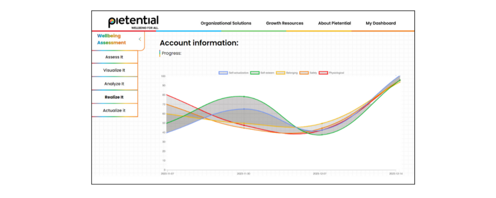 Pietential’s platform is built around five key domains, based on a well-established framework of human needs, which offers a comprehensive view of employee wellbeing: